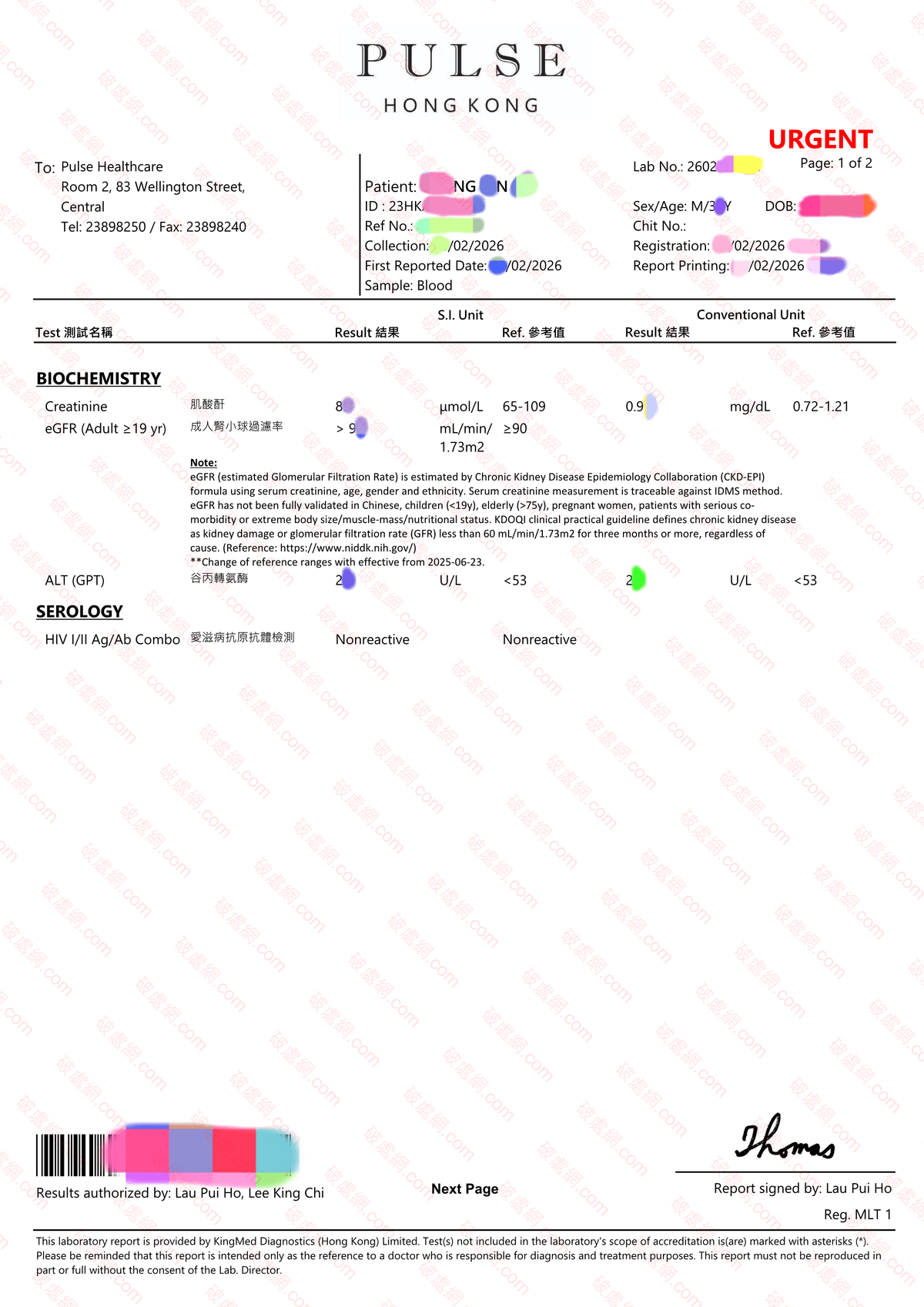 HIV 1/2 antigen / antibody (Immunoassay) Negative HIV 1/2抗原/抗體(免疫測定)陰性